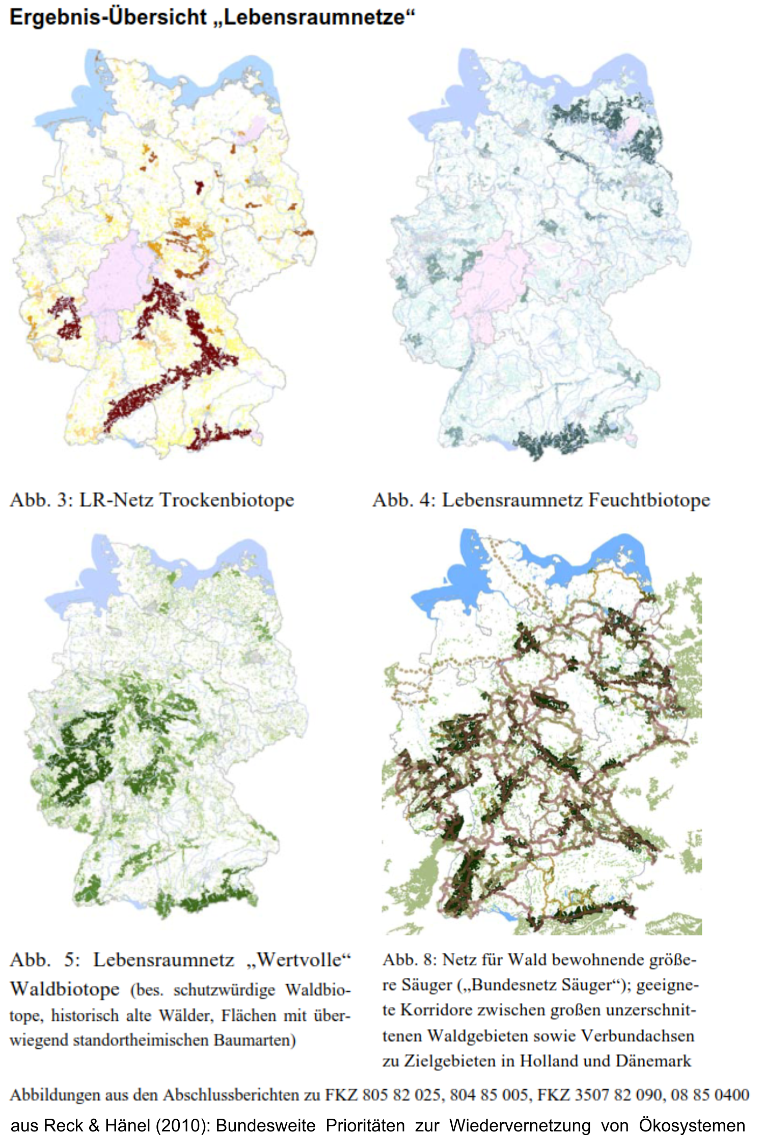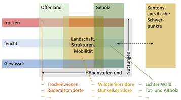 - Landschaftsverbindungen: In erster Linie Korridore für mobile terrestrische und aquatische, tag- und nachtaktive Arten zur Gewährleistung der Landschaftsdurchlässigkeit bezie-hungsweise grossräumigen Ermöglichung von Bewegungen (z.B. Wildtierkorridore, Dunkel-korridore, störungsarme Räume).