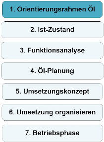 1 Orientierungsrahmen für die ÖI definieren ("Koordinatensystem ÖI") | Im ersten Modul geht es darum, die wesentlichen Anknüpfungspunkte der ÖI-Planung zu bestimmen und daraus den Orientierungsrahmen zu definieren. Anders gesagt wird hier das Koordinatensystem der ÖI für den jeweiligen Kanton bestimmt. Wichtige Punkte sind: Anknüpfung an die Nationalen Prioritäten als Zielrahmen, Bezeichnen der relevanten Naturwerte und -räume im Kanton sowie Definition von Teilebenen / trames / sous-reseaux für die kantonale ÖI-Planung. | |