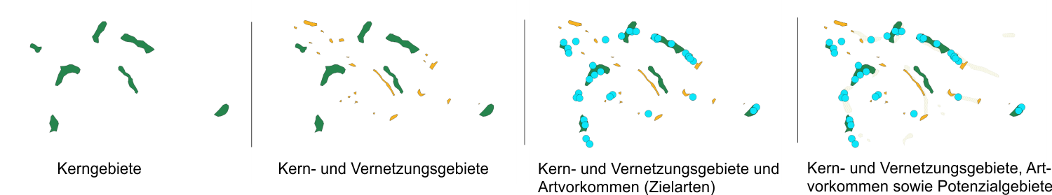 2 Ist-Zustand darstellen | Ziel dieses Moduls ist der Zusammenzug des vorhandenen Wissens und eine Generalisierung bzw. Kategorisierung insbesondere hinsichtlich Kern- und Vernetzungsgebieten für die ÖI. Ausserdem können auch unterschiedliche Teilebenen der ÖI (z.B. trocken-feucht) unterschieden werden. Entsprechend handelt es sich auch immer um eine Momentaufnahme bzgl. Zustand und Stand des Wissens sowie Kenntnisse. | |
