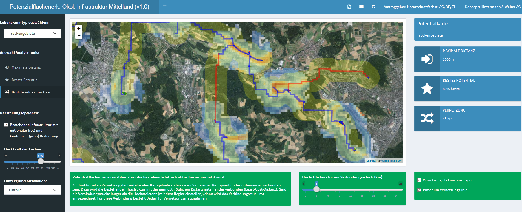 - Für das Projekt ÖIM wurde ein Tool zur Potenzialanalyse entwickelt «Räumliche Identifikation von potenziellen Erweiterungs- und Aufwertungsflächen zur Ergänzung der ökologischen Infrastruktur» - die Anwendung beschränkt sich allerdings auf das Mittelland: Screenshot, Kurzbeschrieb sowie Link zur Webseite mit dem Tool und ausführlicher Bericht.