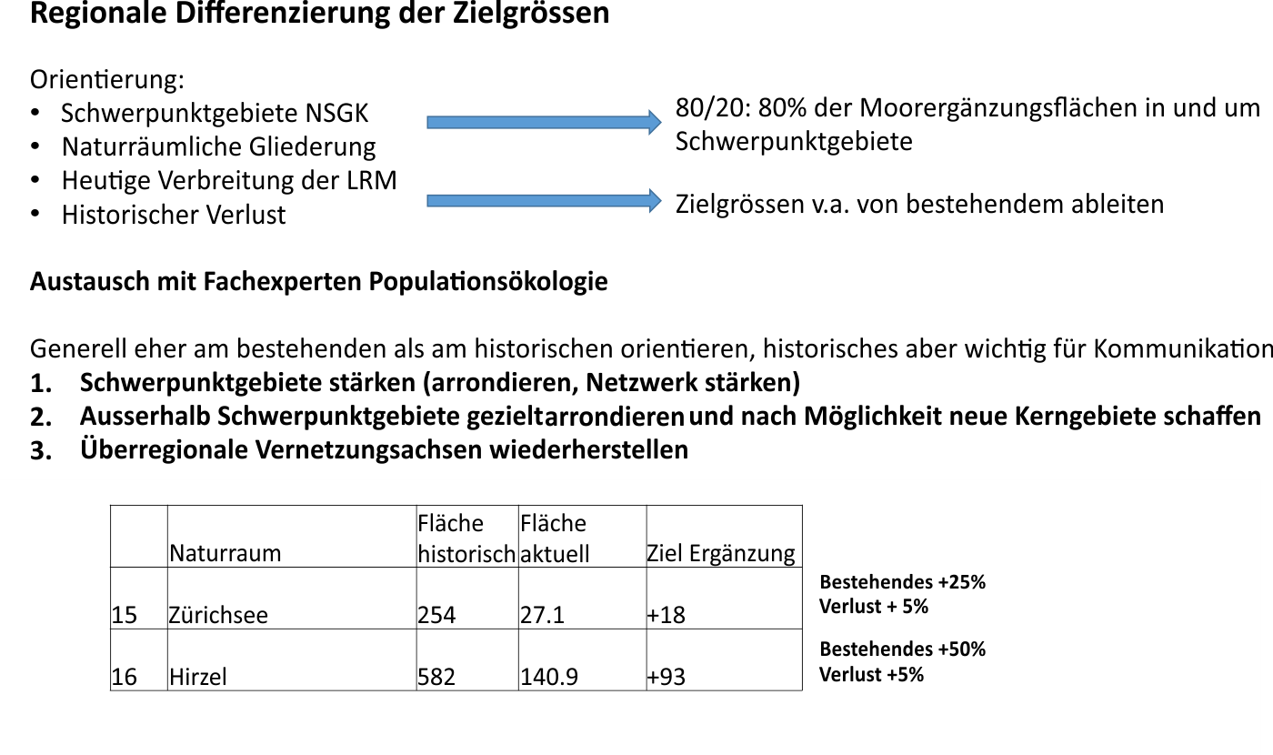 Neben der räumlichen Schwerpunktsetzung soll die ÖI-Planung auch den bestehenden Flächenbedarf konkret ausweisen. Vom BAFU wird im Herbst 2020 eine gesamtschweizerische Grundlage vorgestellt, differenziert nach biogeografischen Teilregionen. Darauf können sich die Kantone bei ihren Analysen abstützen und diese Grundlagen auf kantonaler Ebene konkretisieren, präzisieren und wo nötig ergänzen.