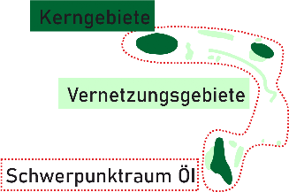 - Kerngebiete (KG) sind Gebiete mit einem hohen Wert für die ÖI, zu einem grossen Teil verbindlich gesichert wie etwa kantonale und nationale Schutzgebiete. Im idealen Fall handelt es sich um Optimalbiotope für die Zielarten, die gleichzeitig als Refugien und Ausbreitungszentren dienen (als „Source-patch“ i.S. des Metapopulationen-Modells). Der aktuelle Zustand kann allerdings von diesem Zielzustand abweichen.