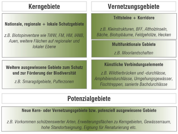 - Vernetzungsgebiete (VG) ergänzen die Kerngebiete als Trittsteine, Ausbreitungsflächen, Korridore oder Kleinstrukturen, erreichen aber nicht dieselbe Qualität wie die Kerngebiete und sind in der Regel auch nicht verbindlich geschützt. In Verbindung mit Kerngebieten ermöglichen sie jedoch die Durchlässigkeit der Landschaft für verschiedene Arten.
